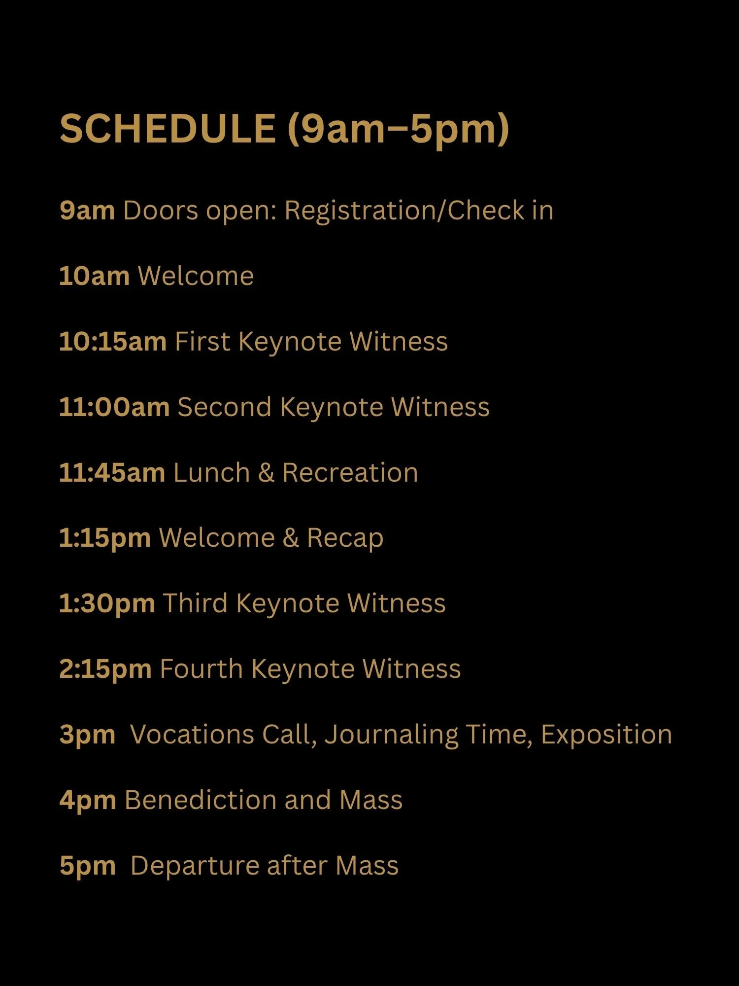 Throughout the day, you’ll be invited into moments of prayer that draw you closer to Christ. There will be opportunities for Mass, Adoration, and personal prayer, woven naturally into the rhythm of the event. These aren’t “add-ons,” but chances to encounter God directly, deepen your relationship with Him, and let His presence guide your life.